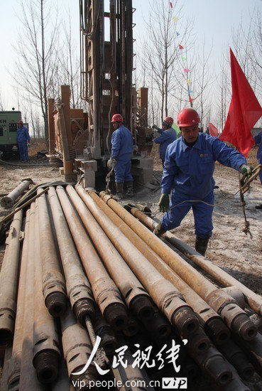 2月15日,山東省地礦局水文地質(zhì)工程地質(zhì)大隊的工人在嚴重缺水的臨沂市沂南縣青駝鎮(zhèn)桃花埠村打井。