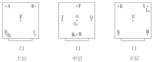 工作室容積大于2m3時,溫度測量點為15個,相對濕度測量點為4個,位置如圖2。