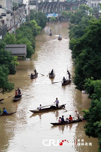 2011年6月20日,浙江蘭溪城里東門至南門路段水漫金山,市民坐船出行。水面上數只小木船構成城市版“江南水鄉”。