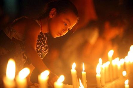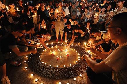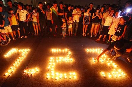 7月25日晚,溫州市民聚在世紀廣場,點燃蠟燭,放飛孔明燈,哀悼7·23動車追尾事故中的遇難者,為傷者祈福.