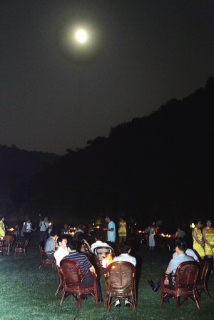 農歷八月十六,中秋賞月好時節。昨晚,明亮皎潔的月光下,如毯的草坪上,支支搖曳的燭光點綴著南山的夜景。幾十張古典雅致的方桌椅,坐著來自社會各界的“見義勇為”代表、“大愛之星”代表、書畫文藝界精英、文明志愿者、風景園林建設者、網民代表等近200人。大家相聚南山,聆聽山水的呼吸,放飛輕松的思緒,品茶、聽樂、寫詩、作畫,共享花好月圓的美好時刻。