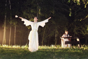 當晚的南山賞月晚會沒有太多刺眼的燈光,也沒有喧囂的歌舞表演,取而代之的是古琴、簫、揚琴、琵琶等民樂演奏。淡雅而纏綿的簫聲從遠處隱隱傳來,溪邊涼亭內身著古裝的文人雅士表演著圍棋對弈、書畫創作、詩詞朗誦等傳統的文化藝術,營造出了溫馨、高雅,又富有望月抒懷情調的氛圍。